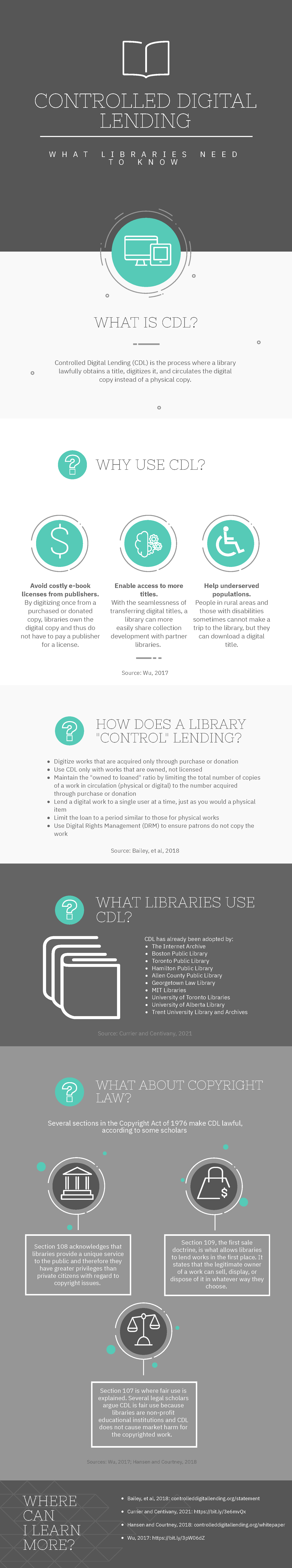 In Fall 2021 for Cultural Foundations of Library Science, I researched Controlled Digital Lending and its associated copyright issues. From that research I created an infographic intended for librarians wanting to better understand CDL.