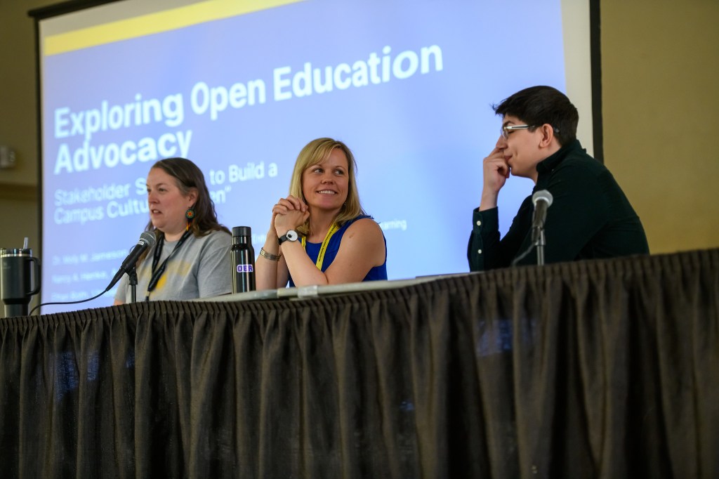 This panel featured three different OER advocates – an undergraduate student, a faculty librarian, and a program administrator – as they shared their specific approaches to OER advocacy in the context of their roles at the University of Northern Colorado.